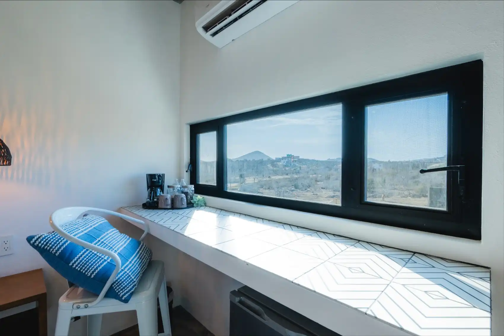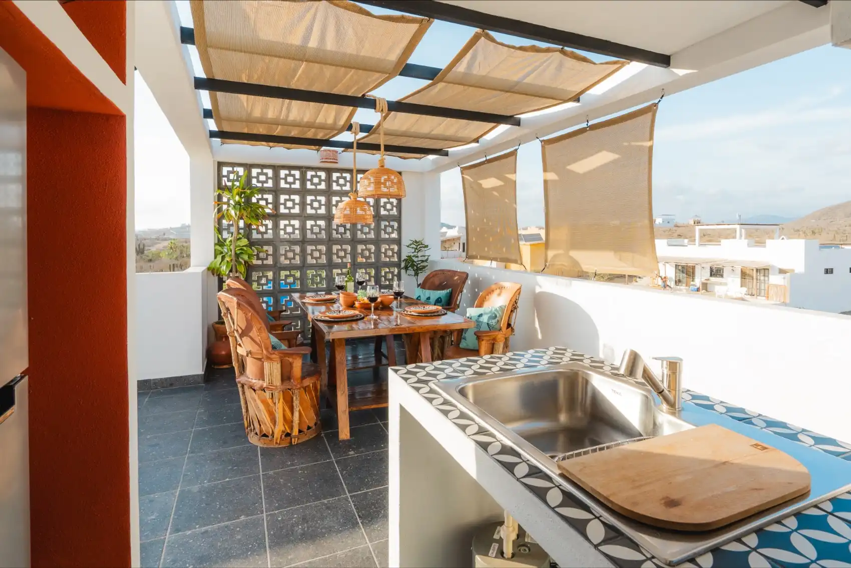 Enjoy access to the shared rooftop, featuring a fully equipped kitchen and spectacular views of the desert landscape and the sea — the perfect spot to cook, unwind, or watch the sunset.